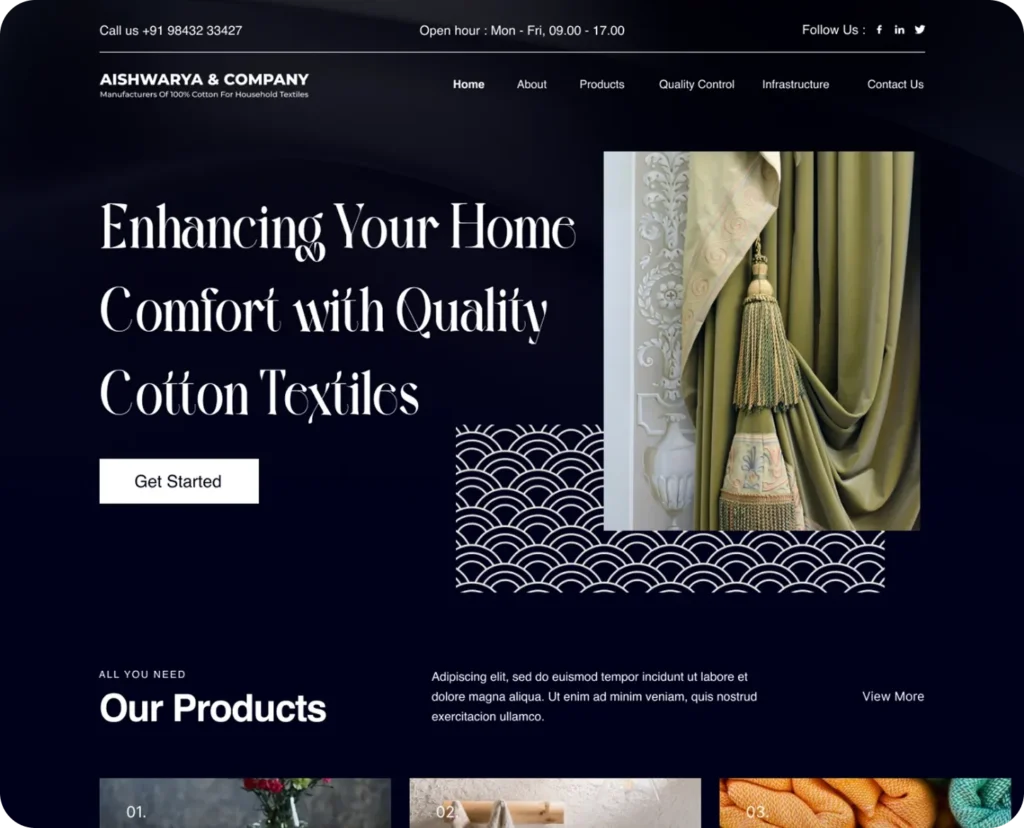 Designed compelling landing page designs for Aishwarya & Company, a global manufacturer of 100% cotton products for household use. The designs effectively communicated the company’s brand identity and value proposition, driving user engagement and conversions.